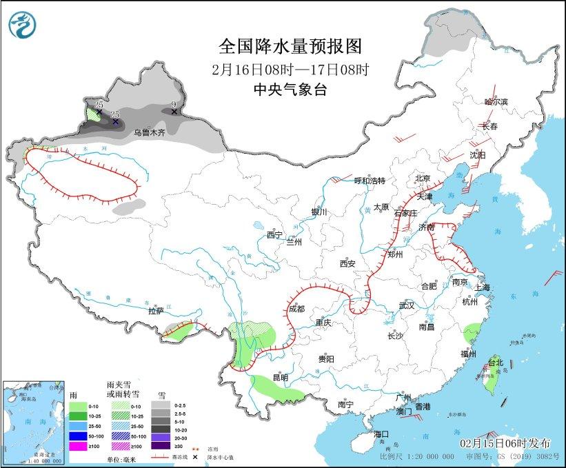2月16日08时至17日08时,新疆北部、内蒙古东北部、黑龙江西北部等地部分地区有小到中雪或雨夹雪,其中,新疆北疆东部和伊犁河谷高海拔地区有大到暴雪,局地大暴雪(20~25毫米)。西藏东南部、四川南部、云南东南部和西北部、浙江南部、福建东北部、台湾岛大部等地部分地区有小雨。内蒙古中东部、黑龙江南部、吉林西部、辽宁西部和北部、辽东半岛、山东半岛、河北南部等地部分地区有4~6级风;东海西南部海域、台湾海峡有7~8级、阵风9级的大风。