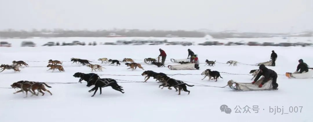 出发了。这阵势,才看出了狗拉雪橇的气派。
