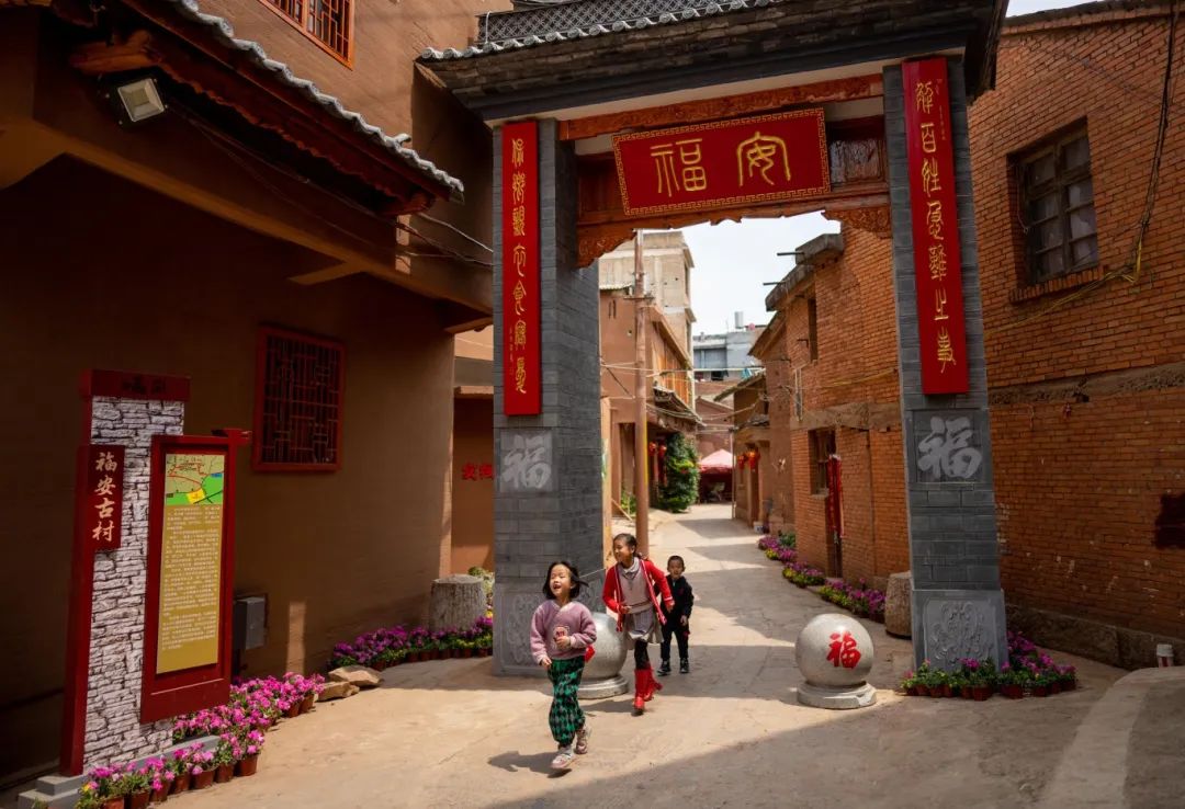 小朋友在晋宁区福安村里玩耍。新华社记者 江文耀 摄晋宁区福安村位于滇池东南岸,村庄始建于明朝初年,至今已有600多年历史。