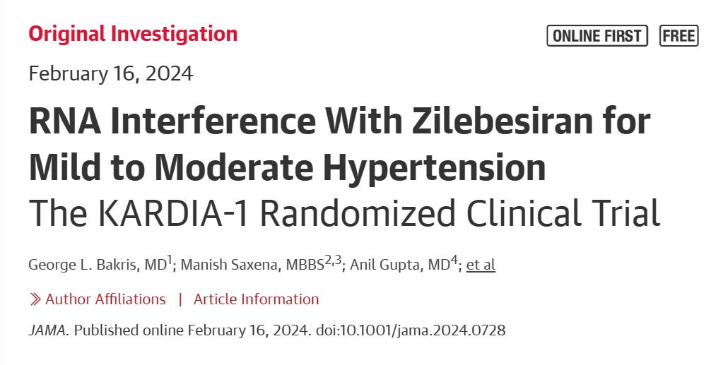 刚刚,在JAMA杂志又发表了关于Zilebesiran的II期临床试验KARDIA-1研究结果,同样令人振奋!(如下图,有兴趣可以按图索骥查找原文阅读)