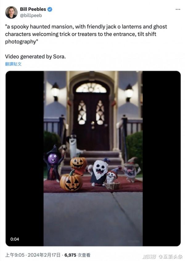 Sora 使用约10000 小时的”高品质“视频训练,OpenAI 表示,Sora 基于DALL·E、GPT 模型的研究成果,一方面使用DALL·E 3 的重述技术,能为视觉数据生成高度描述性的标题,所以Sora 可以更好地遵循用户的指令,生成情感丰富、引人入胜的角色,甚至还能深入理解指令提到的人、事、物在现实世界中的样子。OpenAI的研究人员Bill Peebles在X上公布了几段视频和相应的提示词,比如这个“阴森恐怖的鬼屋,友好的杰克灯笼和幽灵人物在入口处欢迎捣蛋鬼,移轴摄影”,视频画面很好地呈现了描述词的内容。