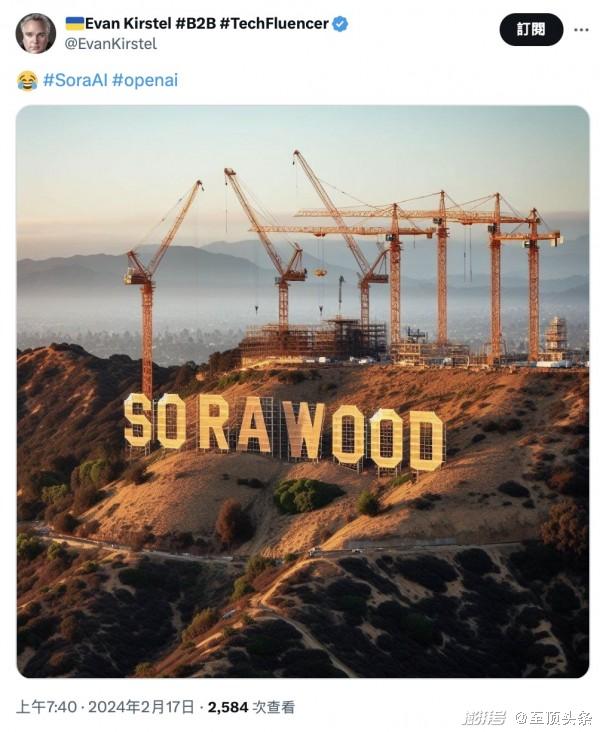 知名科技YouTuber Evan Kirstel直接用“SORAWOOD”替换“HOLLYWOOD”的梗图表达对Sora的感叹。