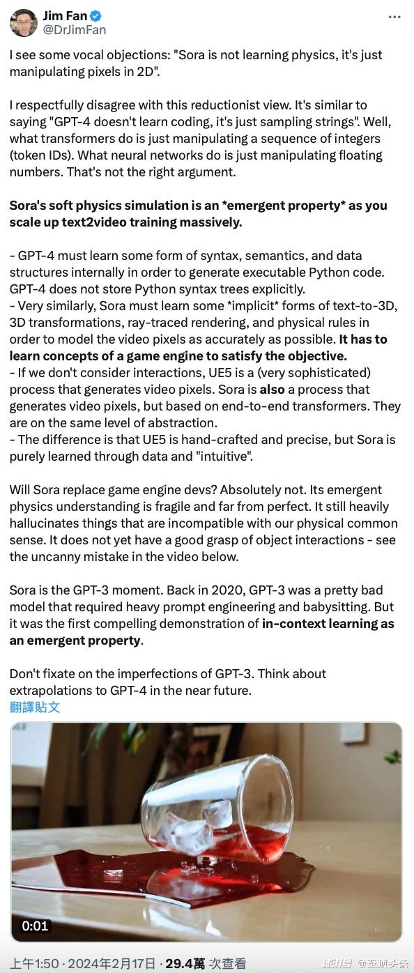 NVIDIA科学家Jim Fan观察到一些针对Sora的质疑,包括那些认为Sora生成视频的过程只是在操作2D像素,对物理并没有真正的理解。他认为这样的观点过于片面,Sora 的软物理模拟是在大规模扩展文本到视频训练时产生的一种自然而然的特性。Jim Fan在推文中分析称,GPT-4 必须内部学习某种语法、语义和数据结构,才能生成可执行的 Python 代码,Sora 也必须学习文本到三维图像、三维变换、光线追踪渲染和物理规则的隐性知识,这样它才能尽可能准确地模拟视频像素。它需要掌握游戏引擎的概念来达成这个目标。