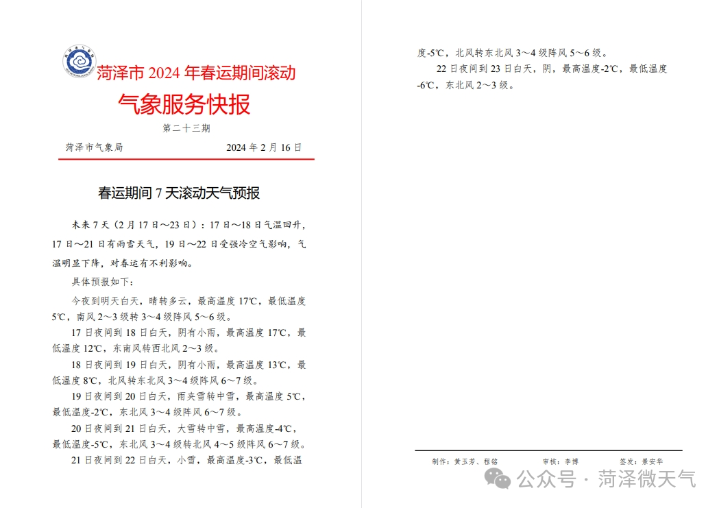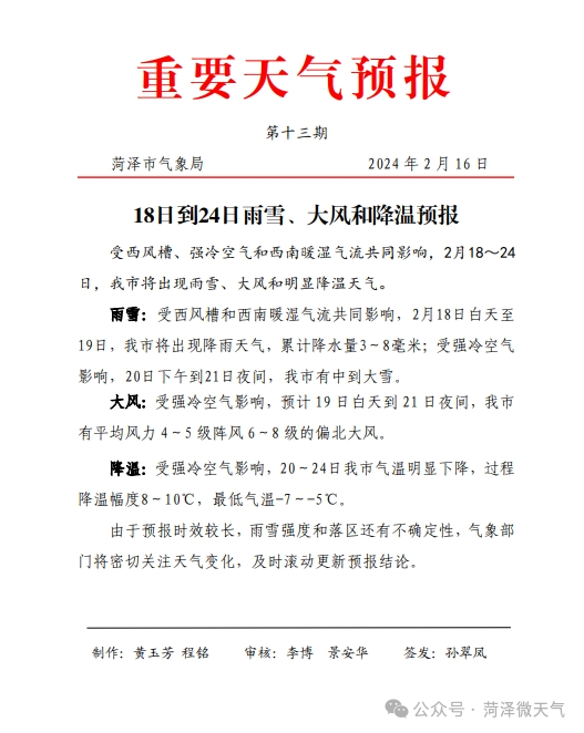 菏泽市气象局16日发布重要天气预报:受西风槽、强冷空气和西南暖湿气流共同影响,2月18日到24日,我市将出现雨雪、大风和明显降温天气。