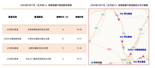 预计春节吉林返程高峰是2月17日(正月初八),高速易拥堵路段主要是G1京哈高速、G12珲乌高速、G2501长春绕城高速、S1长长高速等,建议行驶到以下路段的车主时刻注意路况,及时躲避拥堵。