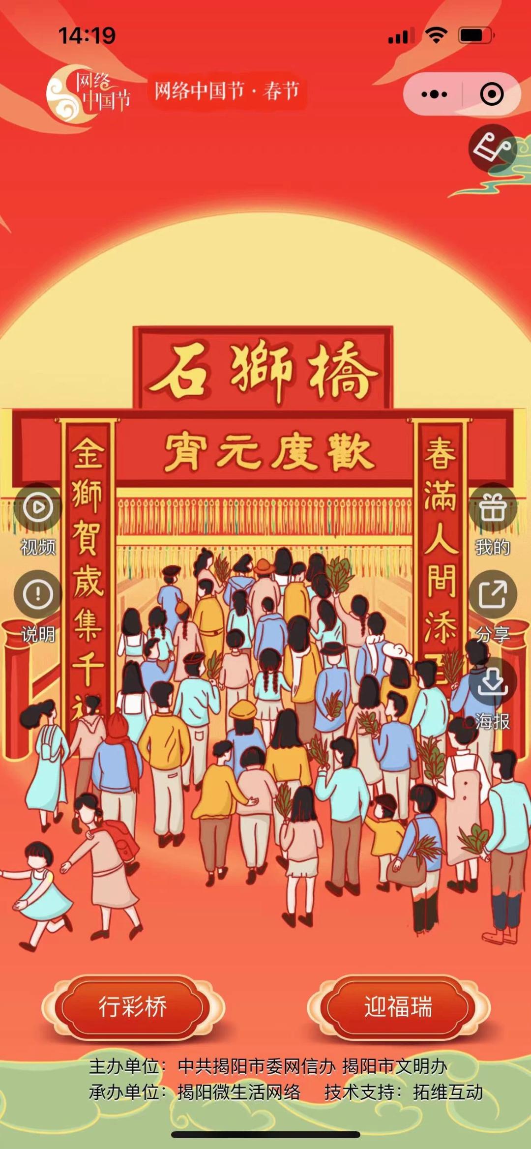 活动通过国风手绘的画面,呈现出正月十一行彩桥的民俗文化场景,用户可通过线上“云”行彩桥、摸狮祈福参与互动游戏,以及下载精美海报分享祝福。