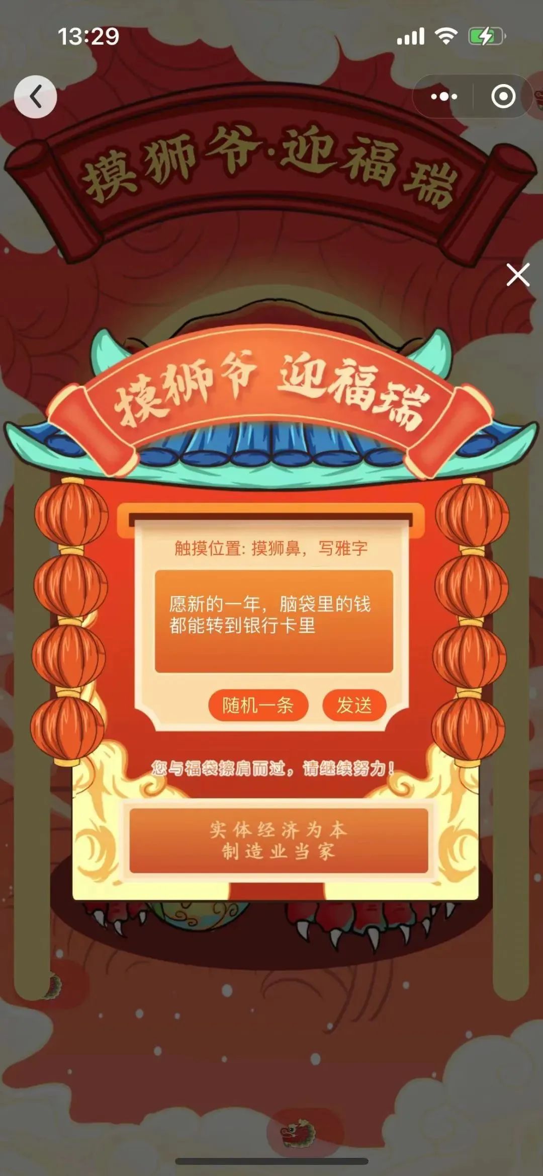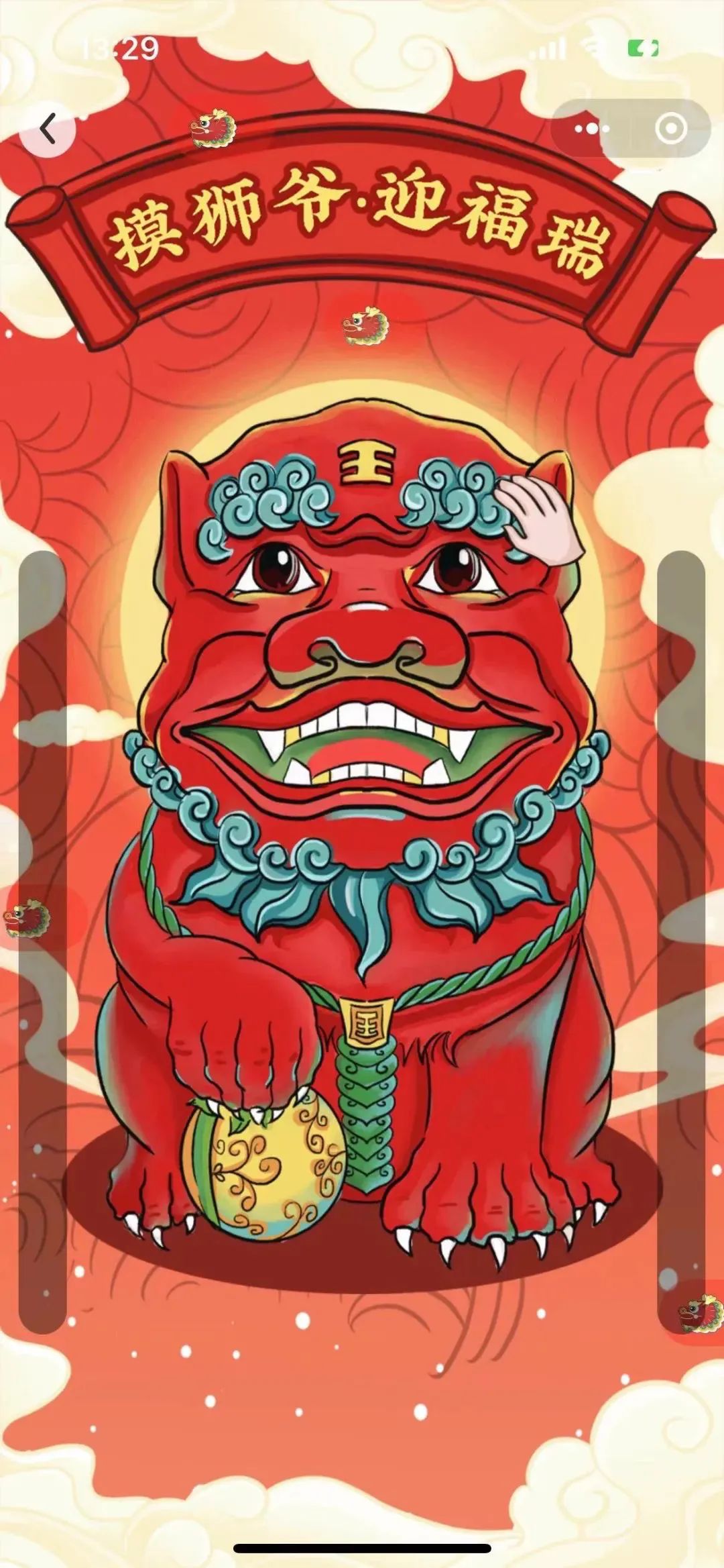 02用户通过点击“金狮爷”身上相应部位,并轻轻移动,即可完成“摸狮祈福”,完成后可发送祈福吉言,祈福吉言会以弹幕的形式在屏幕上轮播;