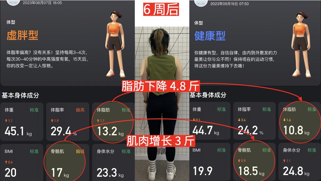 6 周的时间,脂肪下降 4.8 斤,肌肉增长 3 斤,体脂率下降了 5.2%!