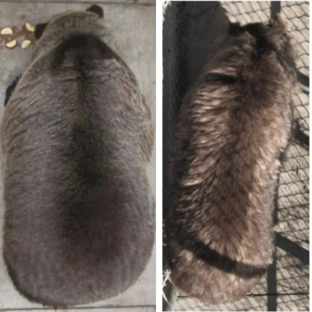 同一只熊,十月份冬眠前的样子(左),次年四月份冬眠结束后的样子(右)