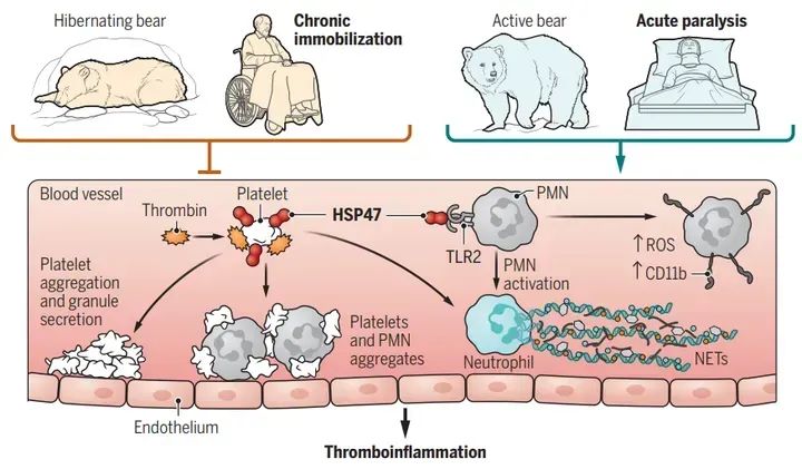 对于相关研究者来说,HSP47并不是一个“陌生”的蛋白质。在先前的研究中科学家发现,除了其他功能外,这种蛋白质还存在于参与血栓形成的血小板表面,可以帮助血细胞粘在一起。当伤口形成血块时,它们会阻止身体流血并帮助伤口愈合;但是,当血液在静脉内凝固而不能自然溶解时,就可能形成致命的血栓。具体来说,血小板上的HSP47能够激活中性粒细胞,使其形成一个“网”,从而捕获蛋白质、病原体和细胞;而HSP47含量较少的血小板不太可能吸引和结合抗感染的白细胞——中性粒细胞,而这是血栓形成的关键步骤。换言之,由于冬眠的熊产生的HSP47较少,它们的血液不太可能形成这些“网”,因此冬眠时熊的血液也不容易凝结进而形成血栓,这就是熊得以安心酣睡的秘密所在。