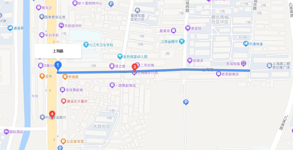 九江市的上海路是一条步行街,位于濂溪区十里大道1276号,始建于2003年6月,全长720米,宽18米,路面选用剁面花岗岩,中间设置了3米宽的休闲带,具有商业、休闲、娱乐、居住、办公5大功能。共青城市