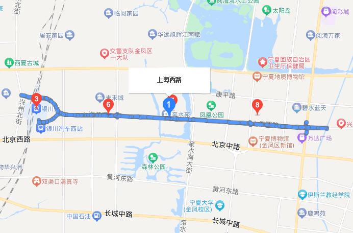 上海西路↑银川市的上海路原名海泽路,2003年更名为上海路,其东端与丽景街相连,西端与通达街相连,是连接银川市兴庆区与金凤区两城区、横贯东西的重要交通干道。道路位于银川市平原地区,地形平坦开阔,道路全长10.9公里。