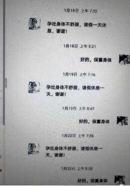 时间回到2022年初,处在孕早期的许女士开始孕吐,也正是因为孕吐,当年1月,她请了8次假,前4次都好好的,可最后4次,单位说许女士的行为属于旷工。