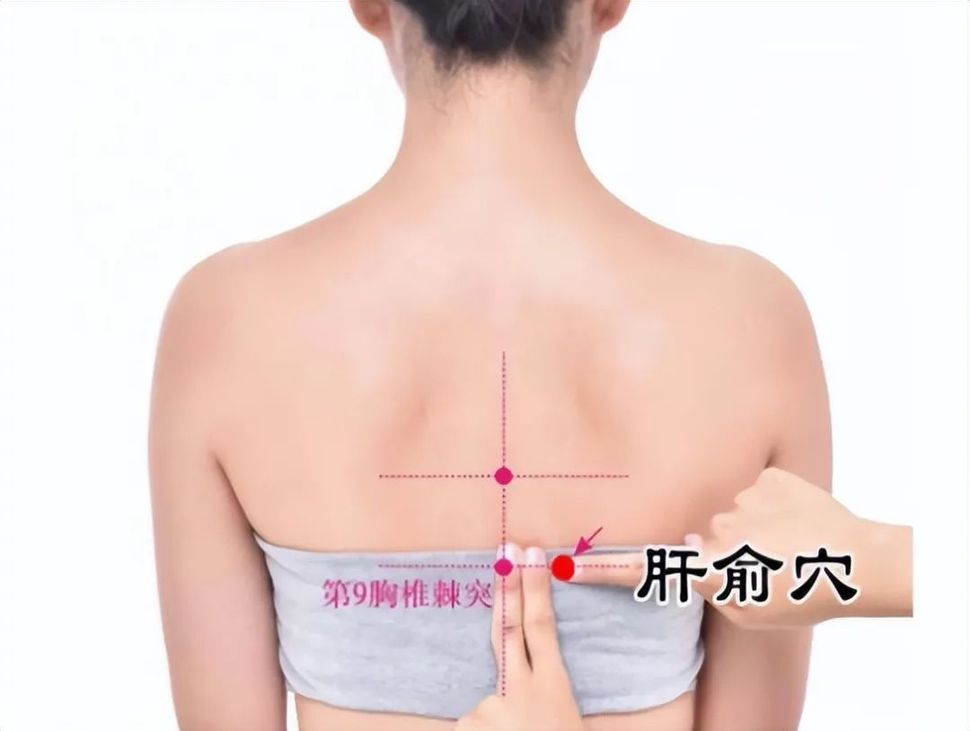 ①肝俞:位于背部脊椎旁,第九胸椎棘突下,左右旁开1.5寸处;