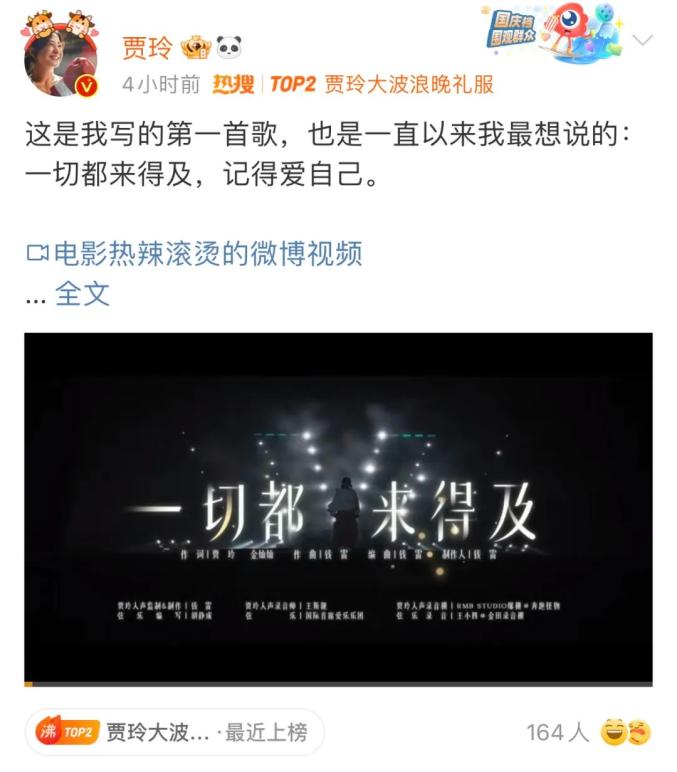 随后,贾玲本人发文宣传:“这是我写的第一首歌,也是一直以来我最想说的:一切都来得及,记得爱自己。”