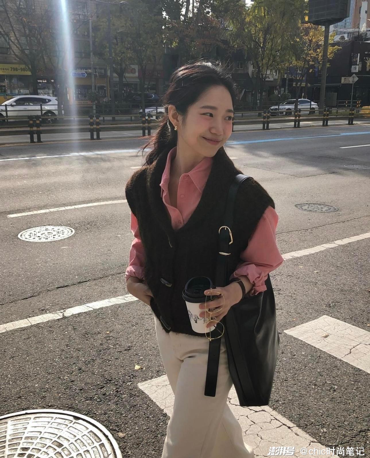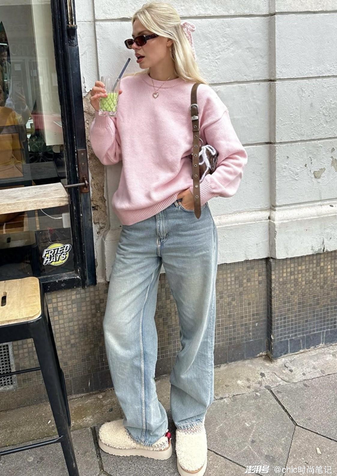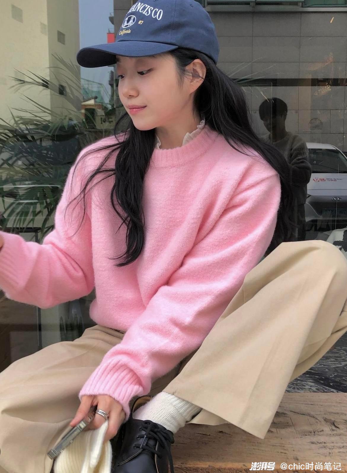 粉色毛衣不仅可以作为内搭,外穿的时候可以内搭蕾丝打底,然后露出一点蕾丝边边,少女心十足,下身搭配浅卡其色直筒裤,减龄又有活力感。
