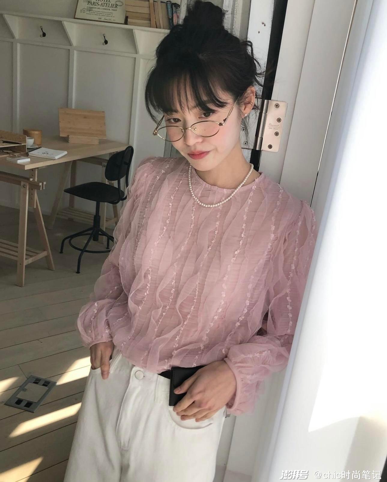 雾粉色衬衫低调又清新。做了荷叶边的细节处理更加精致,下身搭配白色休闲裤,非常经典的韩系穿搭,如果搭配包臀裙,妥妥的OL风。