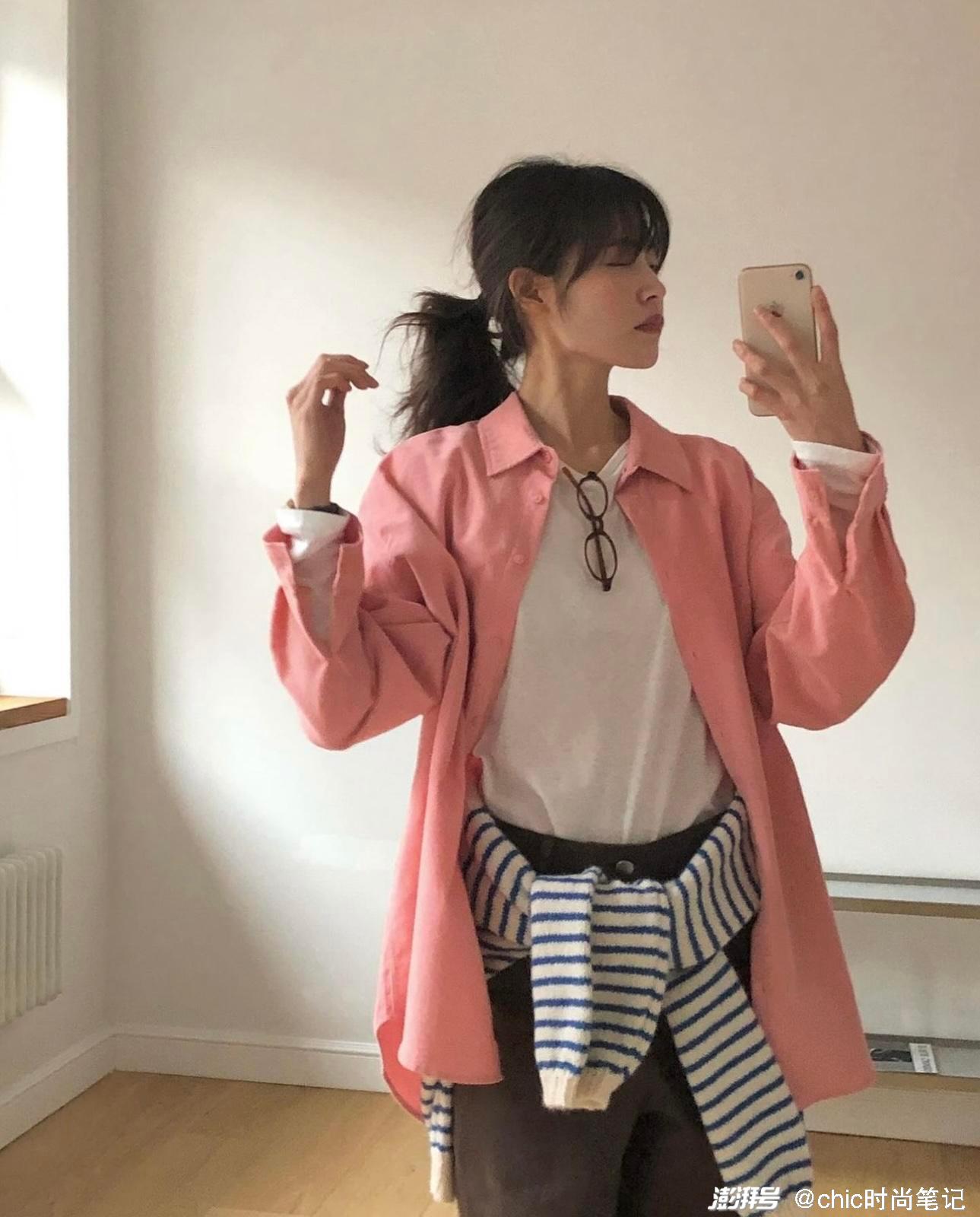 白色打底衫搭配粉色衬衫,衬衫是宽松的版型,会更加松弛有型,搭配一条棕色休闲裤,随性又清新。如果怕冷的话外面可以搭配一件棕色或者黑色外套,保暖又休闲。