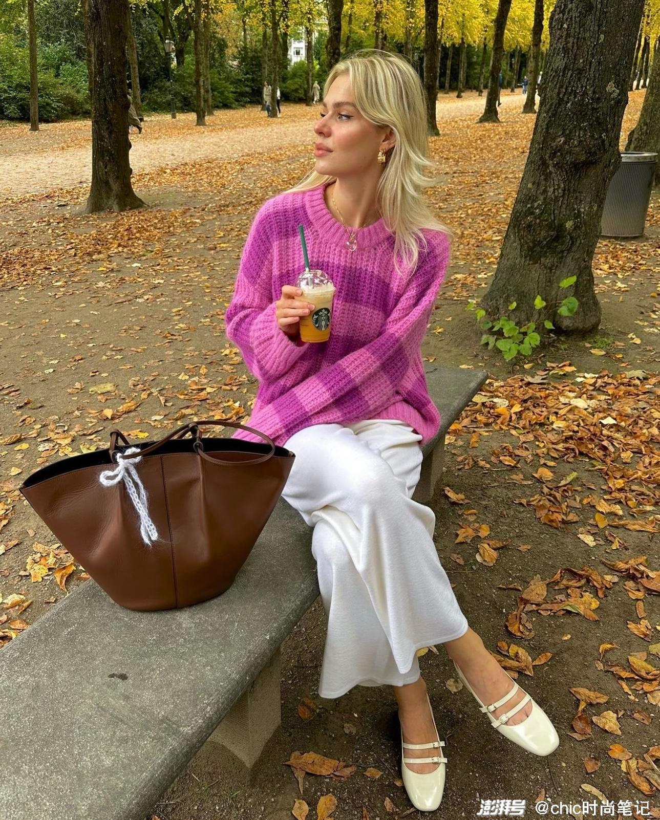 粉色和玫红色相间的毛衣粉嫩可爱,搭配白色阔腿裤,早春的治愈系穿搭get,招桃花穿搭并不是要全身上下都要粉色,选择某一个单品去做搭配即可。