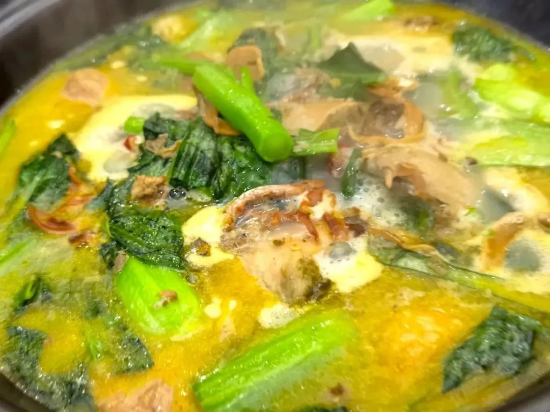 3、河蚌咸肉苔心菜:烧河蚌很有讲究,在去除河蚌土腥味的同时,将它的鲜味完全激发,煸炒过的河蚌肉放入砂锅中炖煮,大火煮开后加入切好的咸肉,小火同煮,苔心菜因为比较嫩,为了保持它的碧绿颜色和口感,要最后放入。在整道菜中,苔心菜吃起来没有太多的纤维感,河蚌的鲜美味道经过炖煮完全融进了汤里,又有咸肉将这清甜的汤头吊得浓郁。淡白色的汤汁,碧绿色的苔心菜,其间夹杂着胭脂色的咸肉,不仅吃在嘴里是春意,看在眼里也是满满的春色。