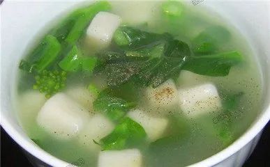 4、苔心菜细圆子:糯米粉入热水,揉成团。搓成细长条,切成小丁,苔心菜洗净,切段。锅内入水,煮开后入细圆子。等到细圆子浮起,就下苔心菜,煮到细圆子再次浮起,就可以了。出锅,只是放些盐行了,清甜、鲜美着呢!