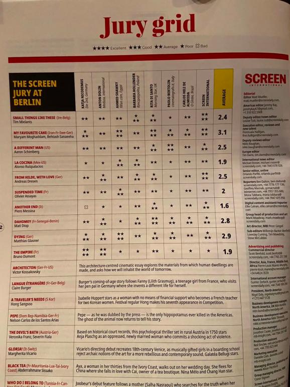 国际场刊评分表今天我们关注的焦点无疑是洪尚秀导演的新作,此次作品《旅行者的需求》是其继去年《在水中》被降级为奇遇单元后再次杀入主竞赛单元,也是其第7次入围柏林电影节主竞赛单元。