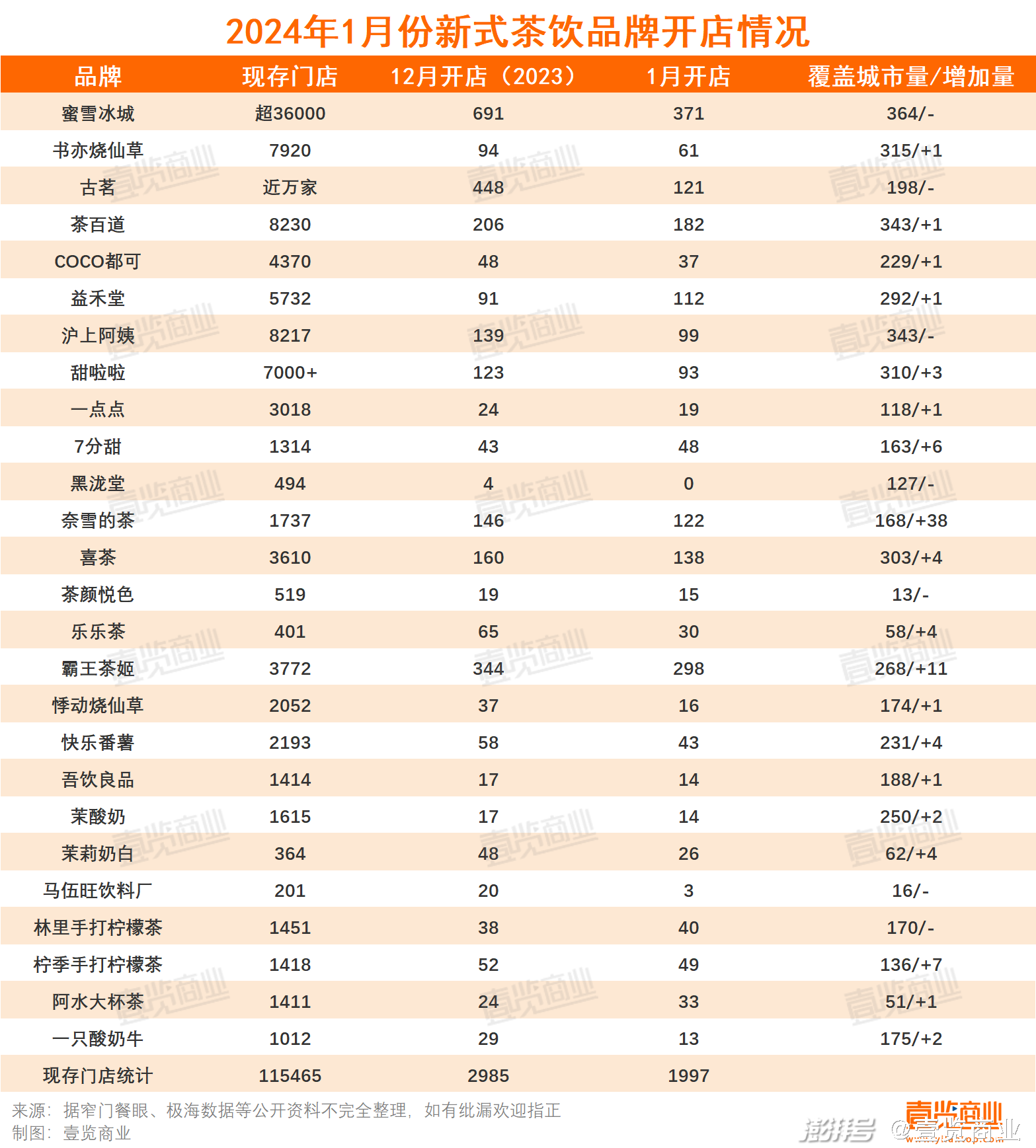 1月,新式茶饮品牌现存门店量达11万,门店扩张速度放缓。