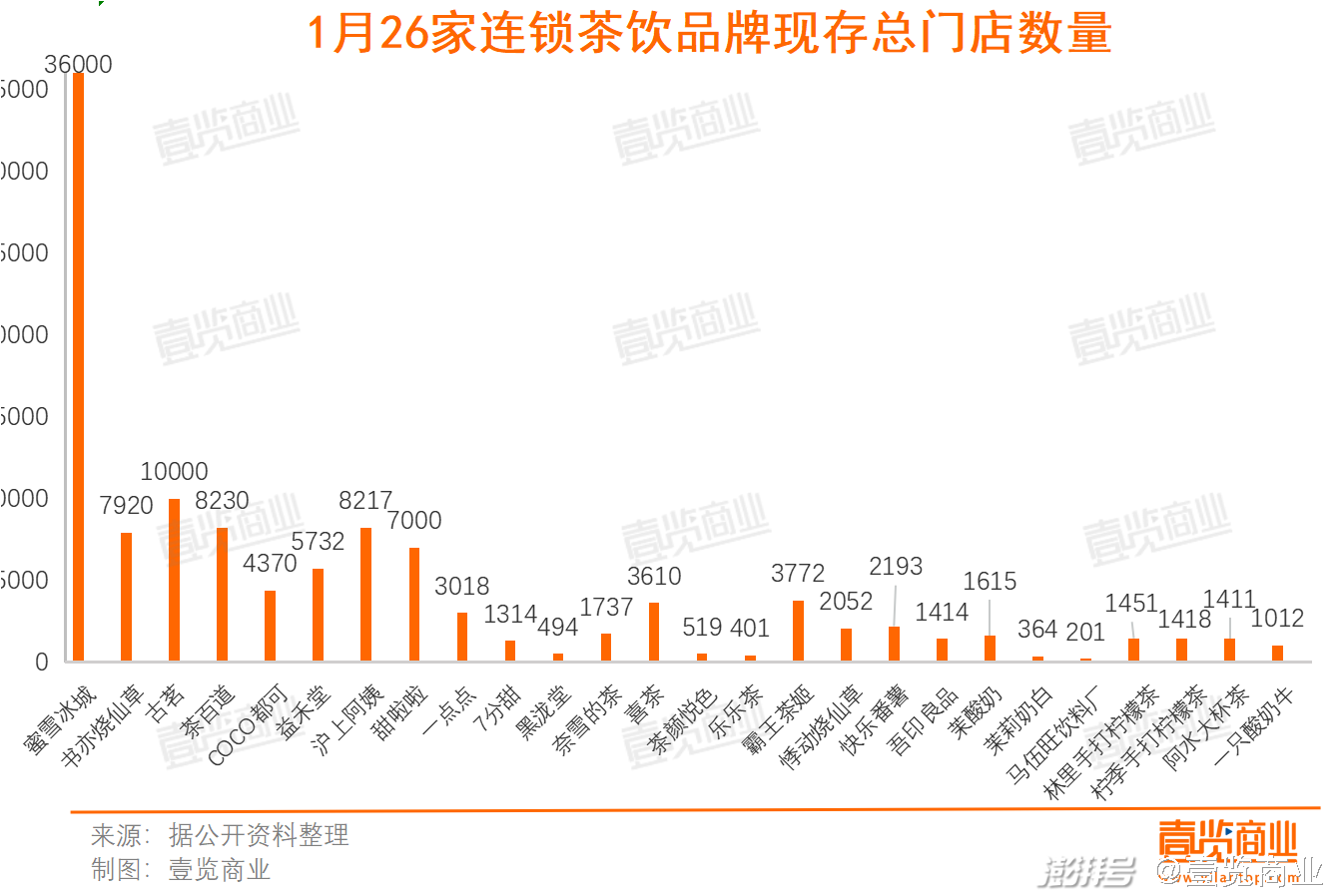 1月份,壹览商业长期跟踪的国内26家连锁茶饮品牌共新开门店数量与上月相比减少988家。