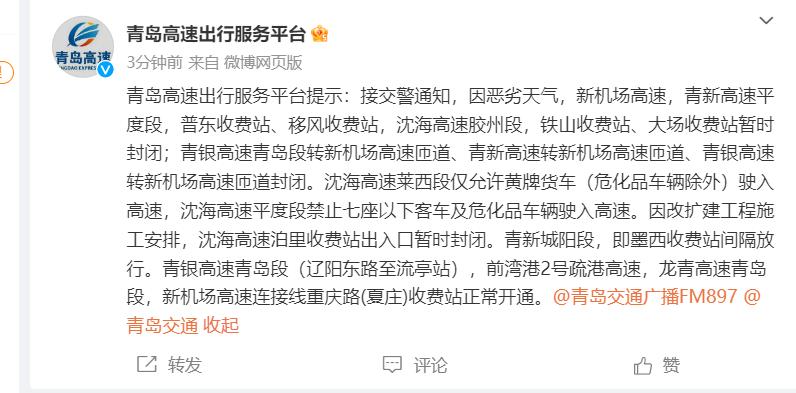 接交警通知,因恶劣天气,新机场高速,青新高速平度段,普东收费站、移风收费站,沈海高速胶州段,铁山收费站、大场收费站暂时封闭;青银高速青岛段转新机场高速匝道、青新高速转新机场高速匝道、青银高速转新机场高速匝道封闭。