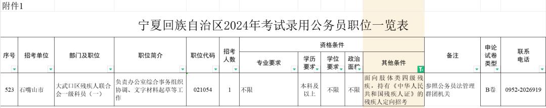 宁夏回族自治区2024年公务员考试报名开始啦!大武口区残联2024年招录1名残疾人专岗公务员。快来看看报考条件吧!