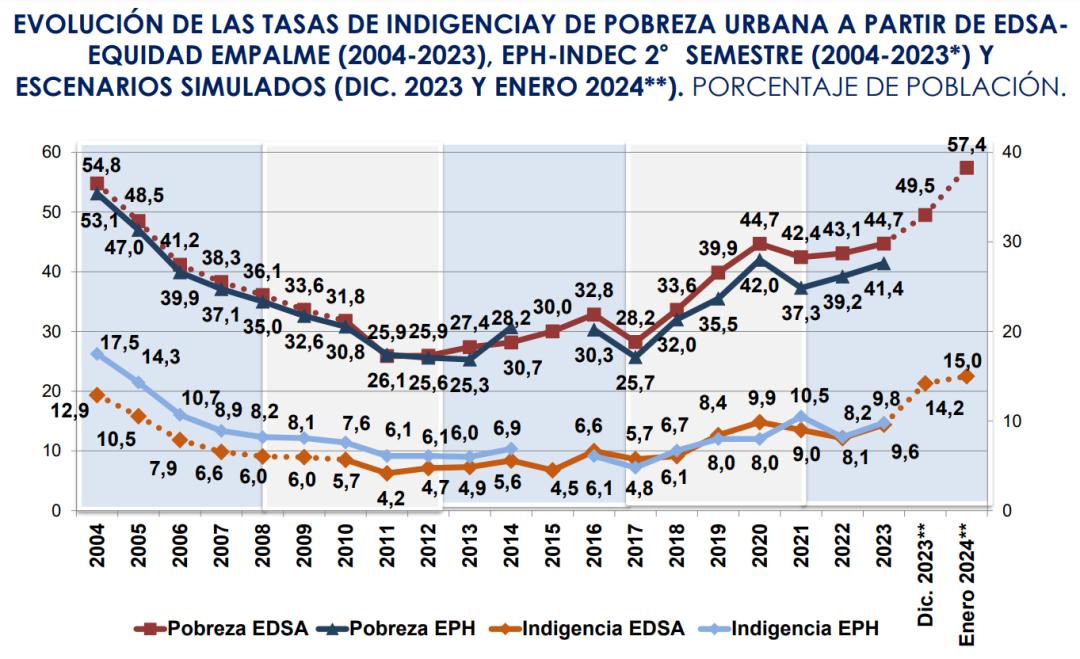 根据阿根廷天主教大学社会债务观察站的数据显示,在今年1月——也就是阿根廷新任总统米莱上任后的首个完整月,阿根廷国内贫困水平大幅上升,当月阿根廷贫困率达到了57.4%,为至少20年来的最高水平。