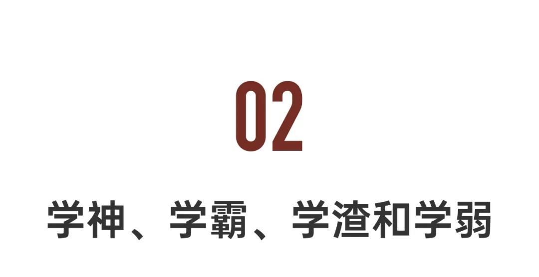最高高在上的就是学神,看起来没在念书但就是成绩很优秀;学霸成绩和学神差不多,但每天都在努力,临考前要开夜车;学渣就是成绩不怎么好,也看起来没在读书的;学弱在食物链的最底层,虽然很努力地学习,但成绩还是不太好。