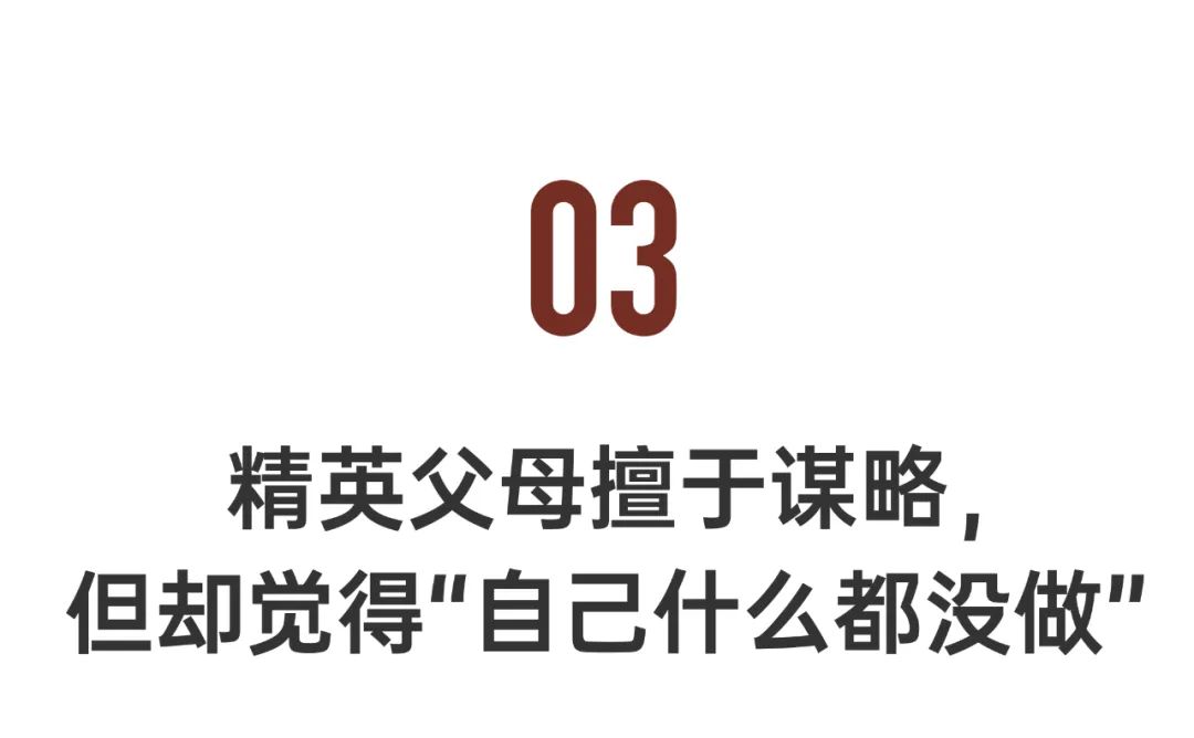 精英父母往往是很擅于谋略的。他们看得到10步以外的距离,知道怎么做可以一步到位,怎么做最有效率;他们知道怎么做能让小孩容易接受,也最皆大欢喜;他们懂得在社交关系里应对进退,能够榨取到别人不想告诉你的独家信息。