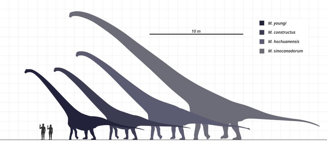 马门溪龙与人类体型的对比,从左至右分别为杨氏马门溪龙、建设马门溪龙、合川马门溪龙、中加马门溪龙|Steveoc 86 / Wikimedia Commons不过,中加马门溪龙的化石并不完全,仅有几节颈椎、颈肋、下颌和部分头部骨骼。在2023年发表的一项研究中,通过与颈部保存更完整的近亲新疆巨龙进行比较,发现过去可能低估了中加马门溪龙的颈部长度——其实际长度可达15.1米,是现今长脖子代表长颈鹿的脖子6倍,当之无愧的全球最长。