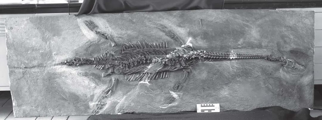 李氏云贵龙的化石|Sato et al., 2010云贵龙化石保存非常完整,仅尾巴末端有缺失。它属于纯信龙类,是蛇颈龙类的祖先,因此也具有长脖子、桨状四肢等招牌特征。过去蛇颈龙的祖先化石保存都很破碎,云贵龙是第一件保存完好的标本,也是目前保存最完好的,对于蛇颈龙家族早期演化的研究有重要意义。