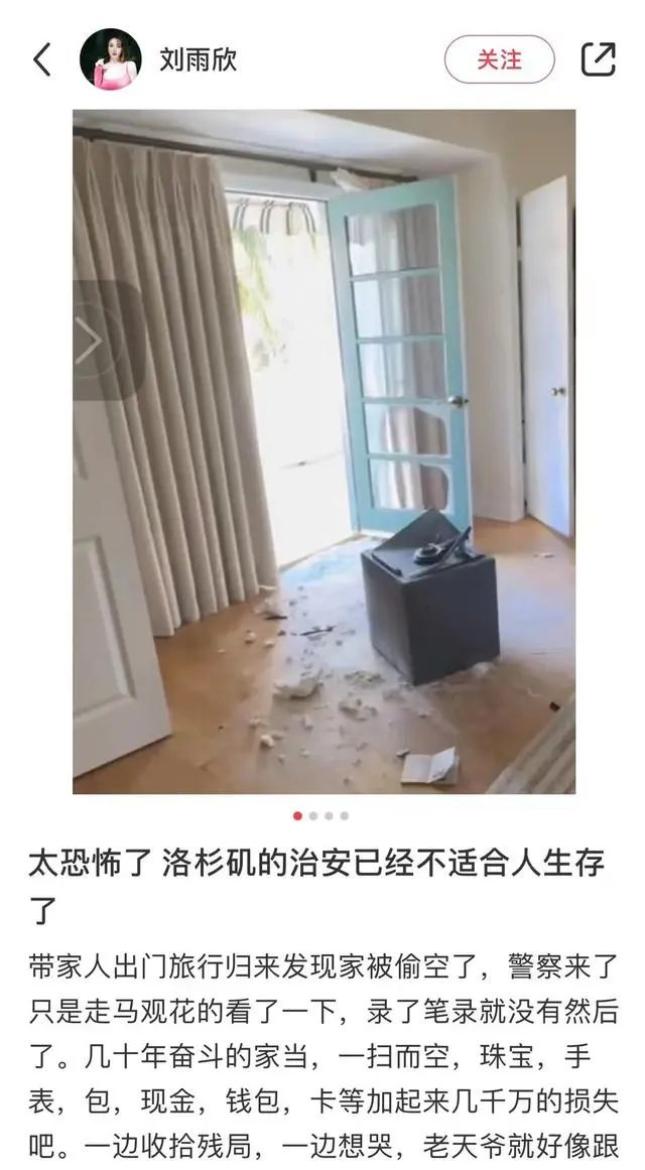 刘雨欣在社交平台发布的图片北京时间19日下午,刘雨欣家人告诉记者,此事已发生10多天,损失数千万元。事发时,刘雨欣带家人在其他国家旅游,回到洛杉矶后不在事发房屋居住。“在洛杉矶比弗利附近被偷,被偷后她心里不舒服,发文宣泄一下。”刘雨欣家人说。