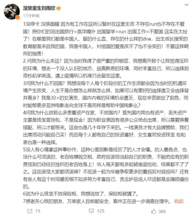 刘雨欣在社交平台回应网友质疑刘雨欣还表示,此次丢失的资产主要是珠宝首饰包,由于职业原因要出席很多公众场合,需要换着搭配,所以才都带去洛杉矶。这些也是她几十年存下来的,珠宝放在保险柜被撬了。“万幸家人目前都安全,案件正在进一步调查处理中。”