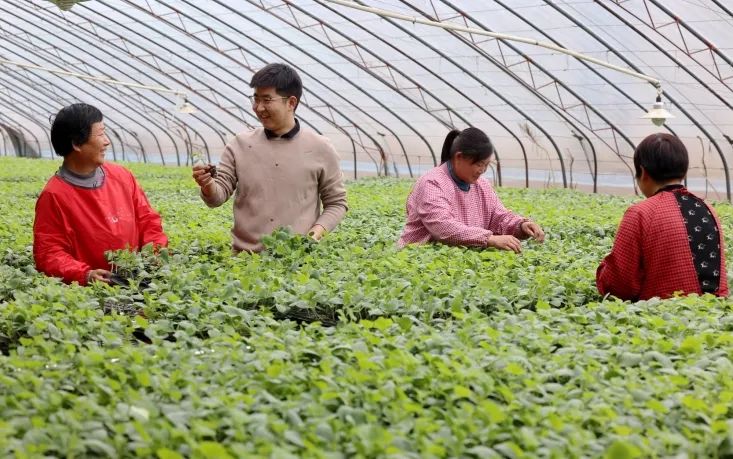 山东省枣庄某育苗基地,农技人员查看蔬菜秧苗生长情况