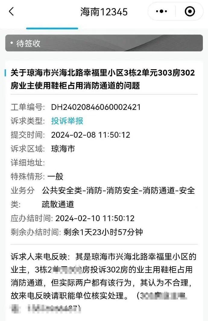 2024年2月8日有市民举报投诉,位于琼海市兴海北路幸福里小区3栋2单元一业主用鞋柜占用消防通道。