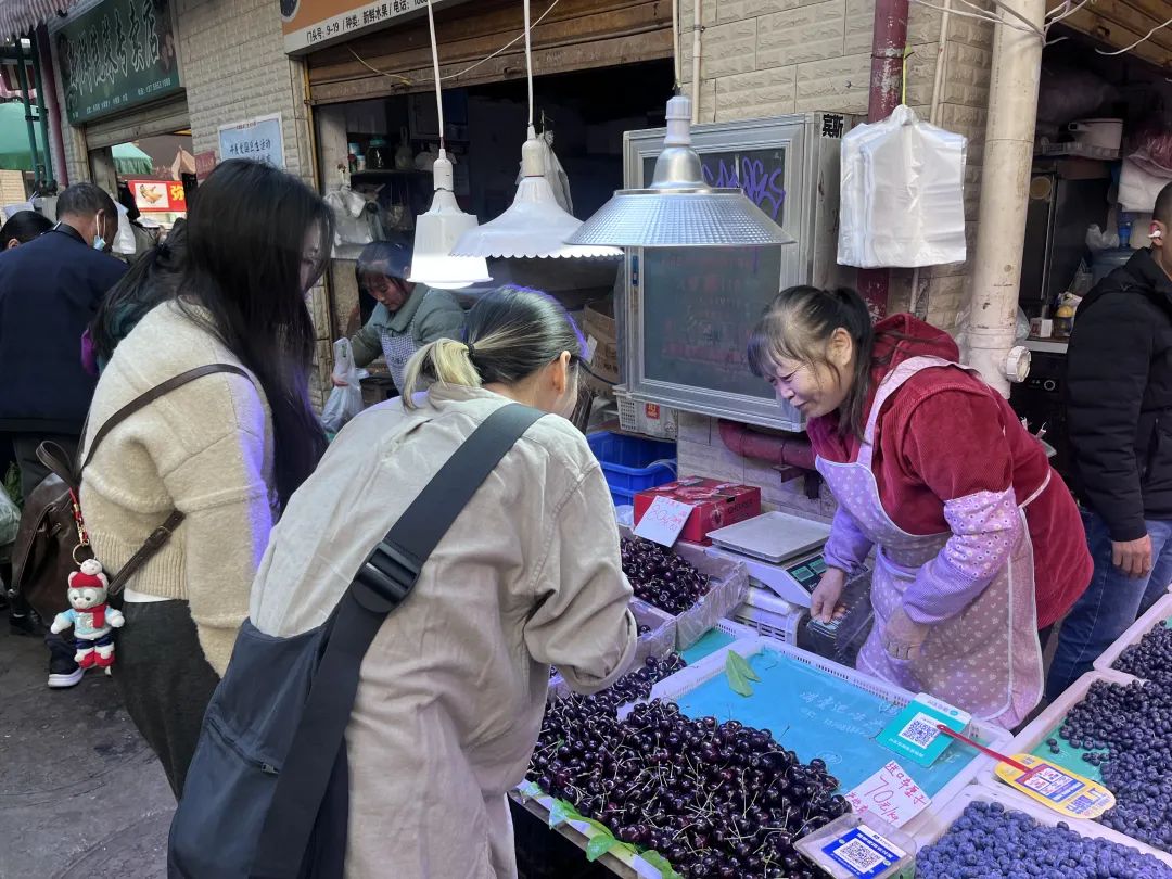 在篆新农贸市场同样有许多售卖车厘子的商家,以散称为主,3J-4J价格为70-100元1公斤。