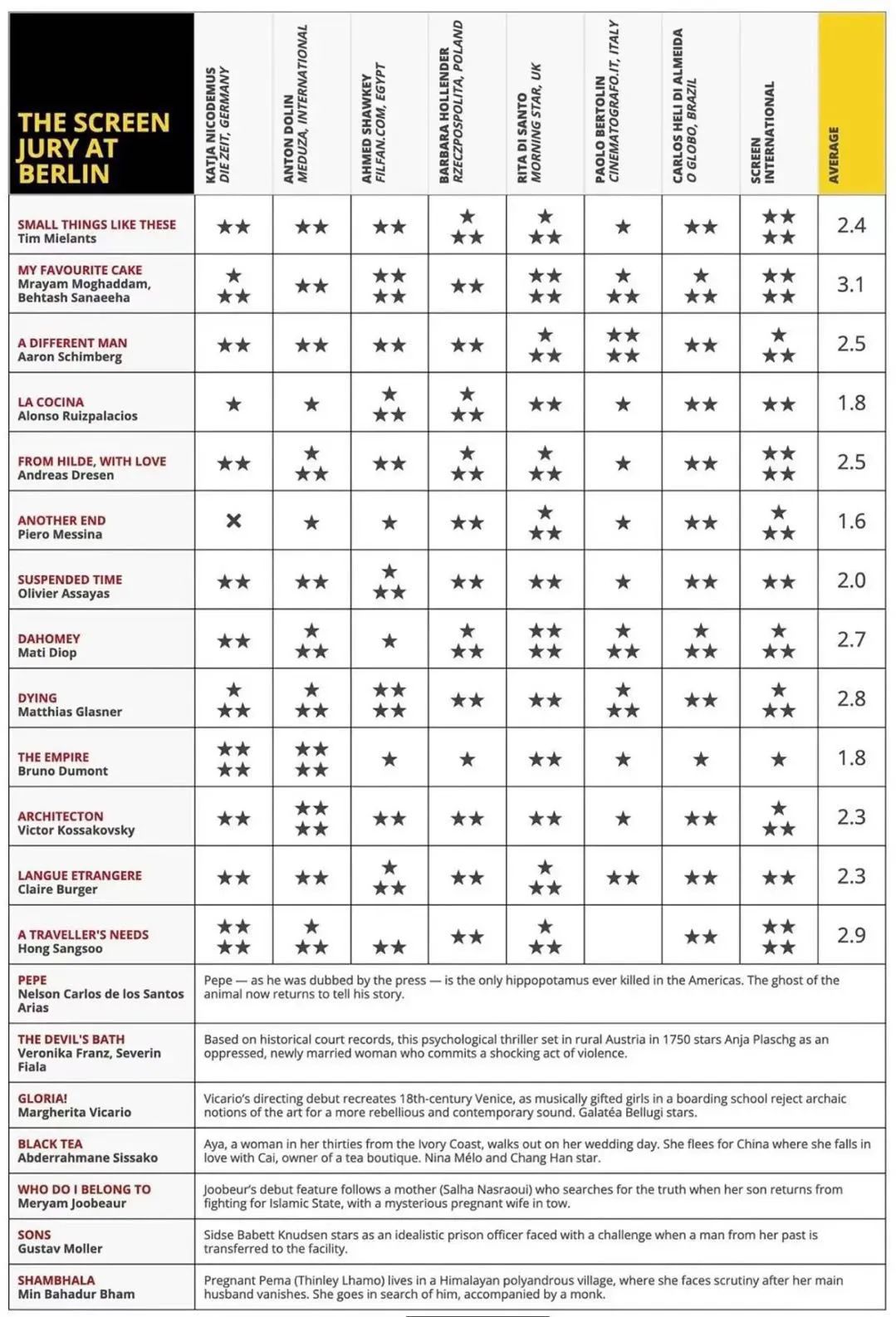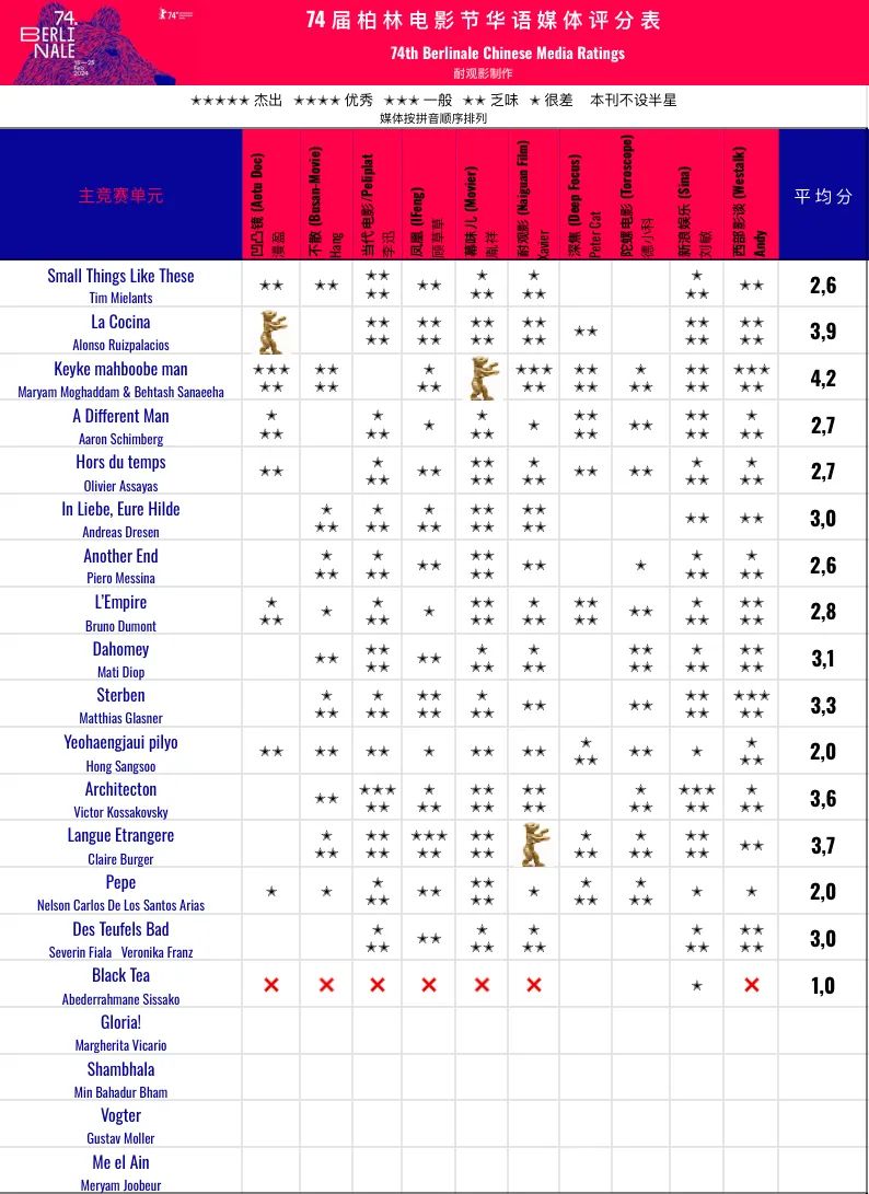 今日是柏林第七日,做一下盘点,目前二十部主竞赛影片已经有十六部进行了媒体放映,只剩下最后四部将在未来两天全部放映完毕。对比华语评分表和国际评分表会发现一个有意思的现象。除了伊朗电影《我最喜欢的蛋糕》在两个评分表都位居最高之外,有几部影片出现了两极分化的现象。在华语刊位居第二的墨西哥影片《厨房》在国际刊列倒数第二,在华语刊倒数第二的洪常秀导演作品《旅行者的需求》在国际刊大受追捧位列第二位。这种由于文化差异,审美差异以及视角差异最终构建的巨大差异更加证明了组建华语评分表在国际电影节的重要性。