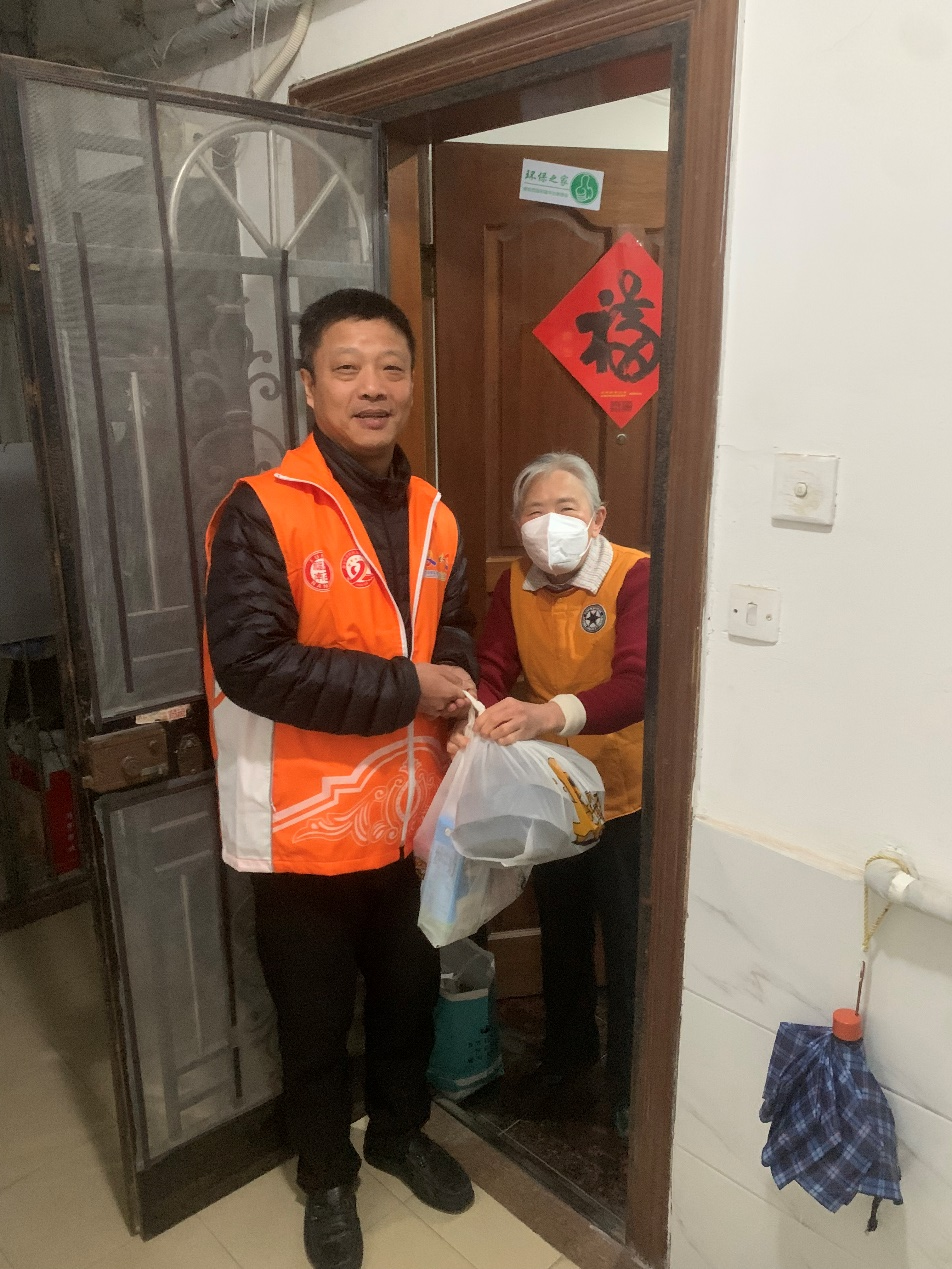 (中国电信上海公司工作人员为华业社区的老人送上生活用品)