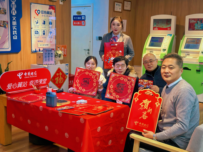(新春期间,中国电信上海公司张杨路营业厅邀用户拓福字、领福袋)