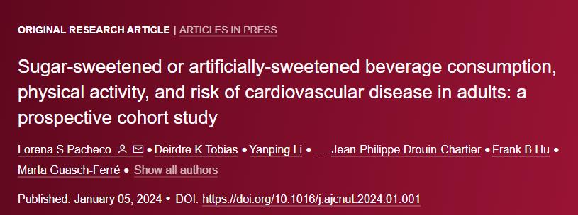 ①Lorena S Pacheco, Deirdre K Tobias, Yanping Li, et al. Sugar-sweetened or artificially-sweetened beverage consumption, physical activity, and risk of cardiovascular disease in adults: a prospective cohort study.Am J Clin Nutr. Available online 6 January 2024.