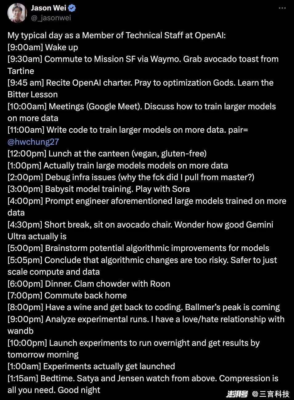 今天凌晨,OpenAI的研究人员Jason Wei自曝每日作息时间,不少网友感叹,原来不只国内卷,OpenAI也搞“996”。