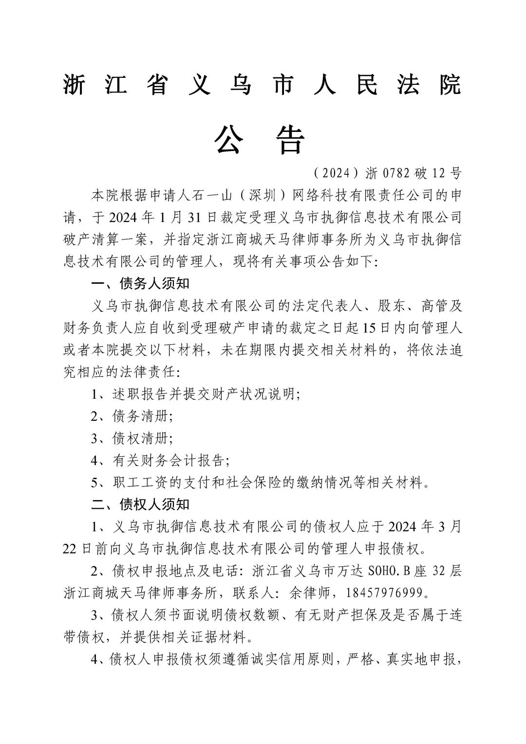 关于义乌市执御信息技术有限公司破产清算案公告 义乌市人民法院 轻触阅读原文