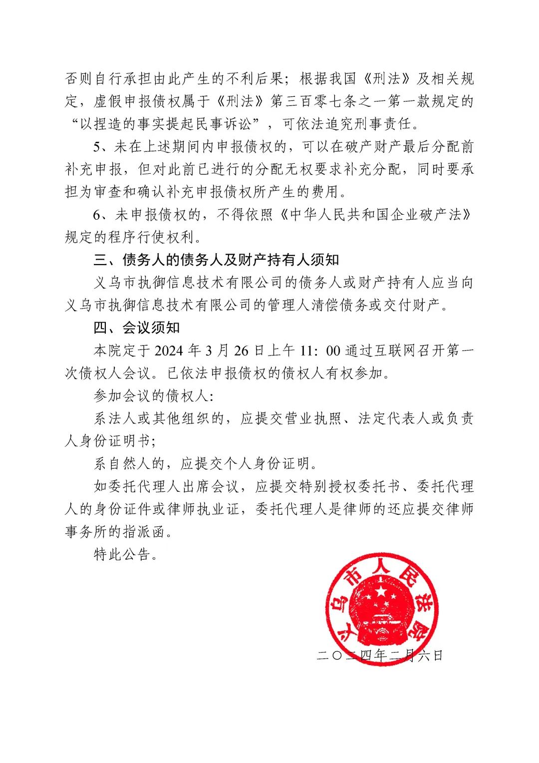 原标题:《关于义乌市执御信息技术有限公司破产清算案公告》