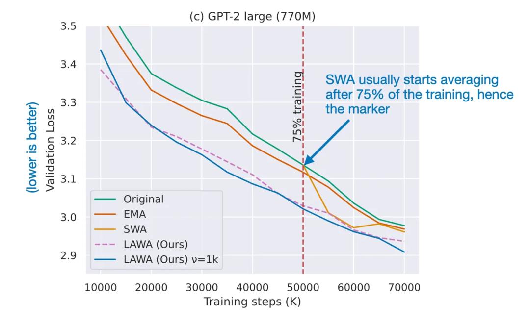 然后到了 2023 年,论文《Early Weight Averaging Meets High Learning Rates for LLM Pre-training》探索了 LaWA 的一个修改版,其使用了更高的学习率,并且在训练期间会更早地在平均检查点中开始。其研究者发现,这种方法能显著提升标准 SWA 和 EMA 方法的性能。