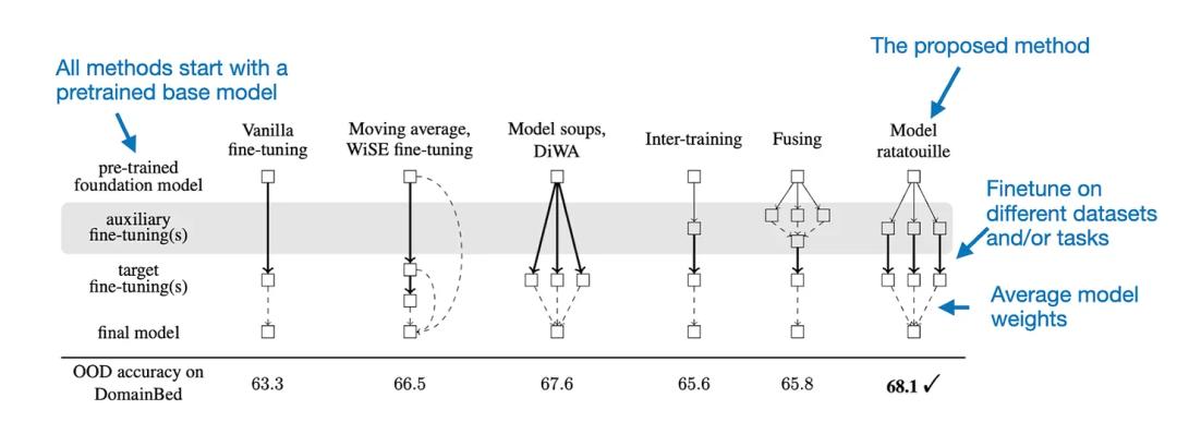 模型融合已有较长的历史,但最近一篇颇具影响力的 LLM 相关论文是《Model Ratatouille:Recycling Diverse Models for Out-of-Distribution Generalization》。(论文地址:https://arxiv.org/abs/2212.10445)