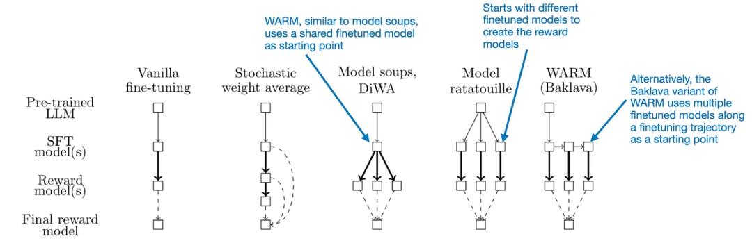 WARM 在 RLHF 过程中的使用方式概况。这里唯一的新东西是该方法使用了来自权重平均的奖励模型,而不是训练单个奖励模型。在此之前,我们已经讨论了一些权重平均方法。那么 WARM 是如何对权重执行平均以获得奖励模型呢?这里,和随机权重平均一样,他们使用了一种简单的线性平均。不过它们也有差别:其模型并不是采样于同一轨迹,而是基于预训练模型独立创建的,这一点和 Model Ratatouille 类似。另外,WARM 还使用了所谓的 Baklava 流程,可以沿微调轨迹进行采样。下图比较了这些差异。